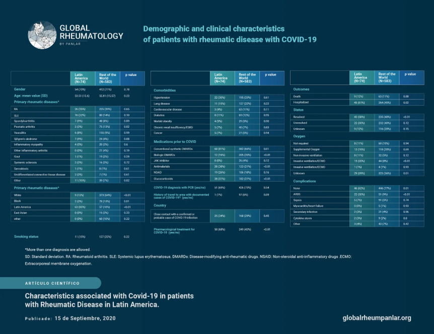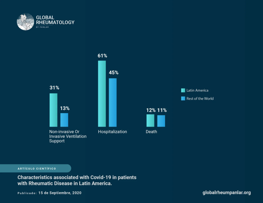 Conclusión. Los pacientes de América Latina con enfermedades reumáticas y COVID-19 reportados a este registro global presentaron una mayor necesidad de soporte ventilatorio, no obstante, tuvieron una mortalidad similar a los pacientes del resto del mundo
