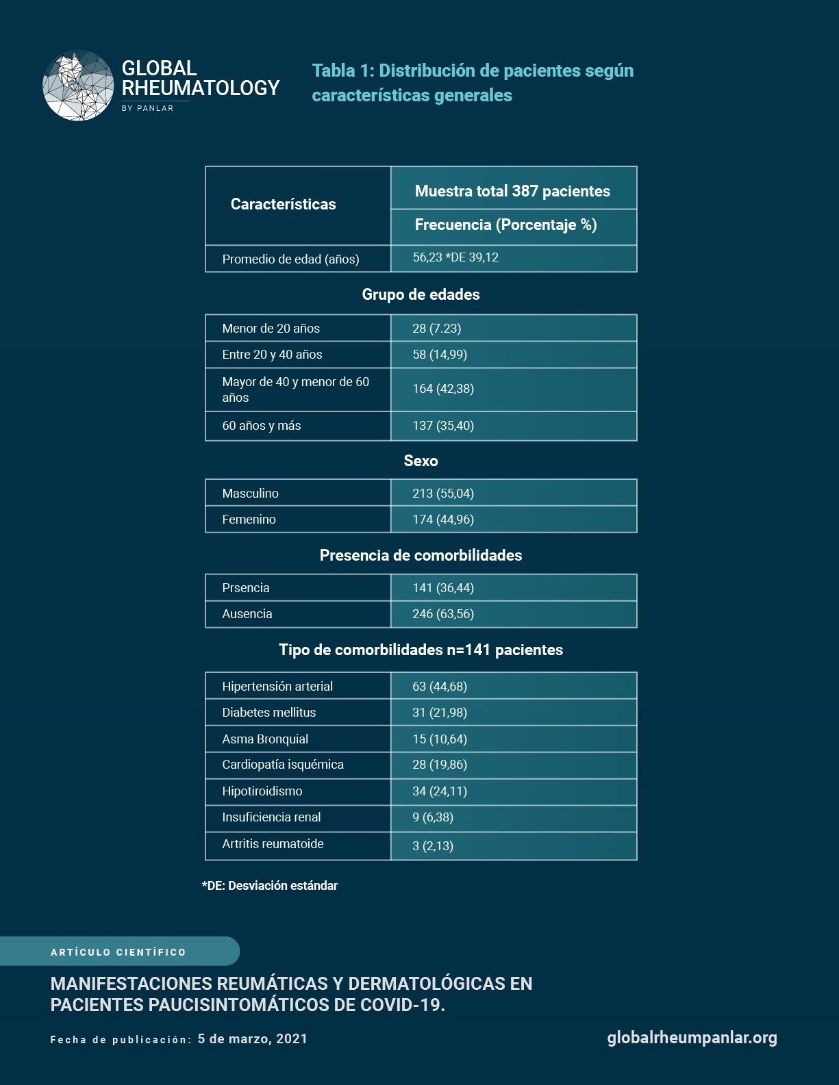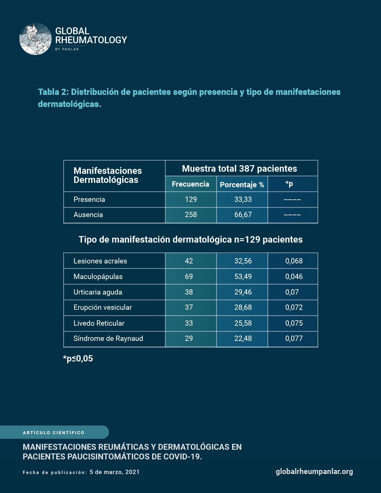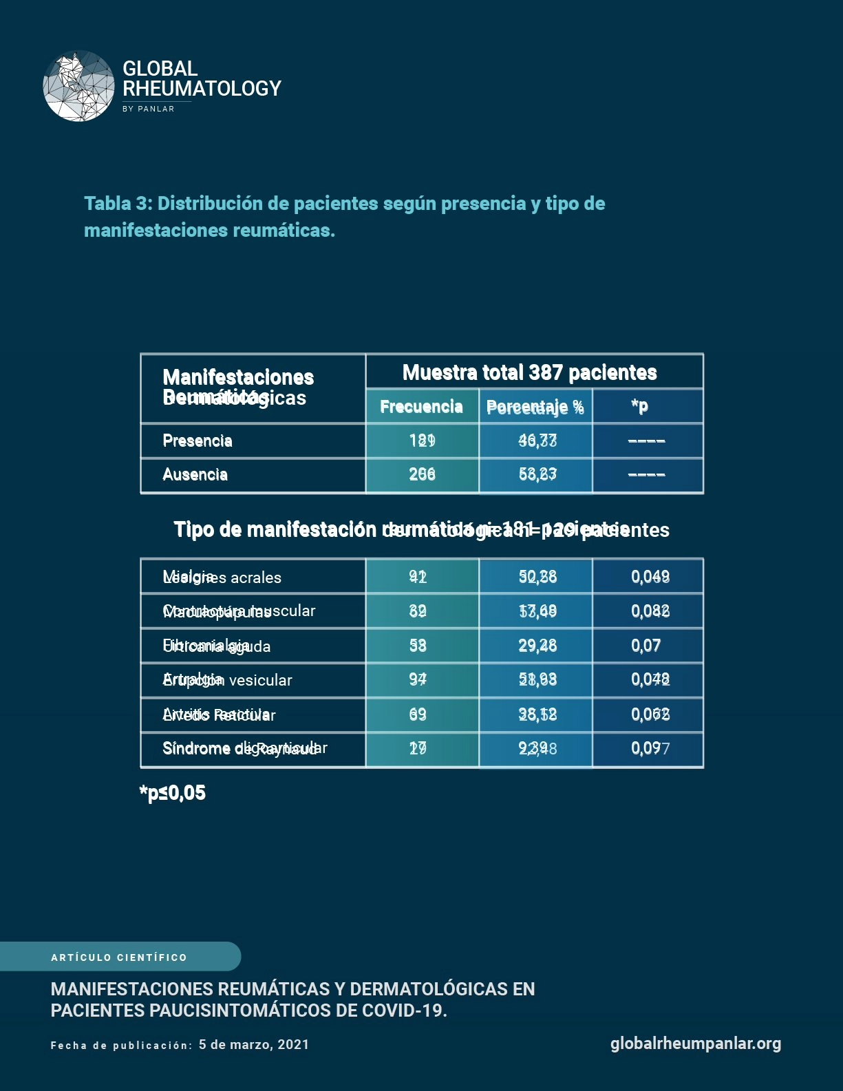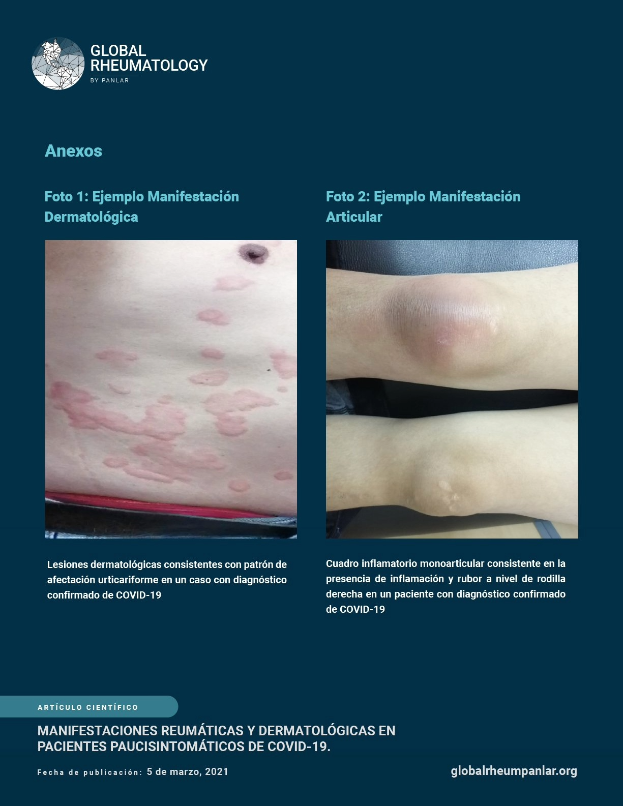 Se han descrito distintas manifestaciones extrarrespiratorias que suelen acompañar a pacientes con COVID-19. Dentro de todas ellas, las manifestaciones dermatológicas y reumáticas han sido señaladas como una de las de mayor expresión clínica en distintos estadios de la enfermedad, incluso en pacientes paucisintomáticos. Se describe que alrededor del 50 % de los pacientes con COVID-19 presenta manifestaciones reumáticas y 7 dermatológicas como parte de la expresión sistémica de esta enfermedad. (4- 7)