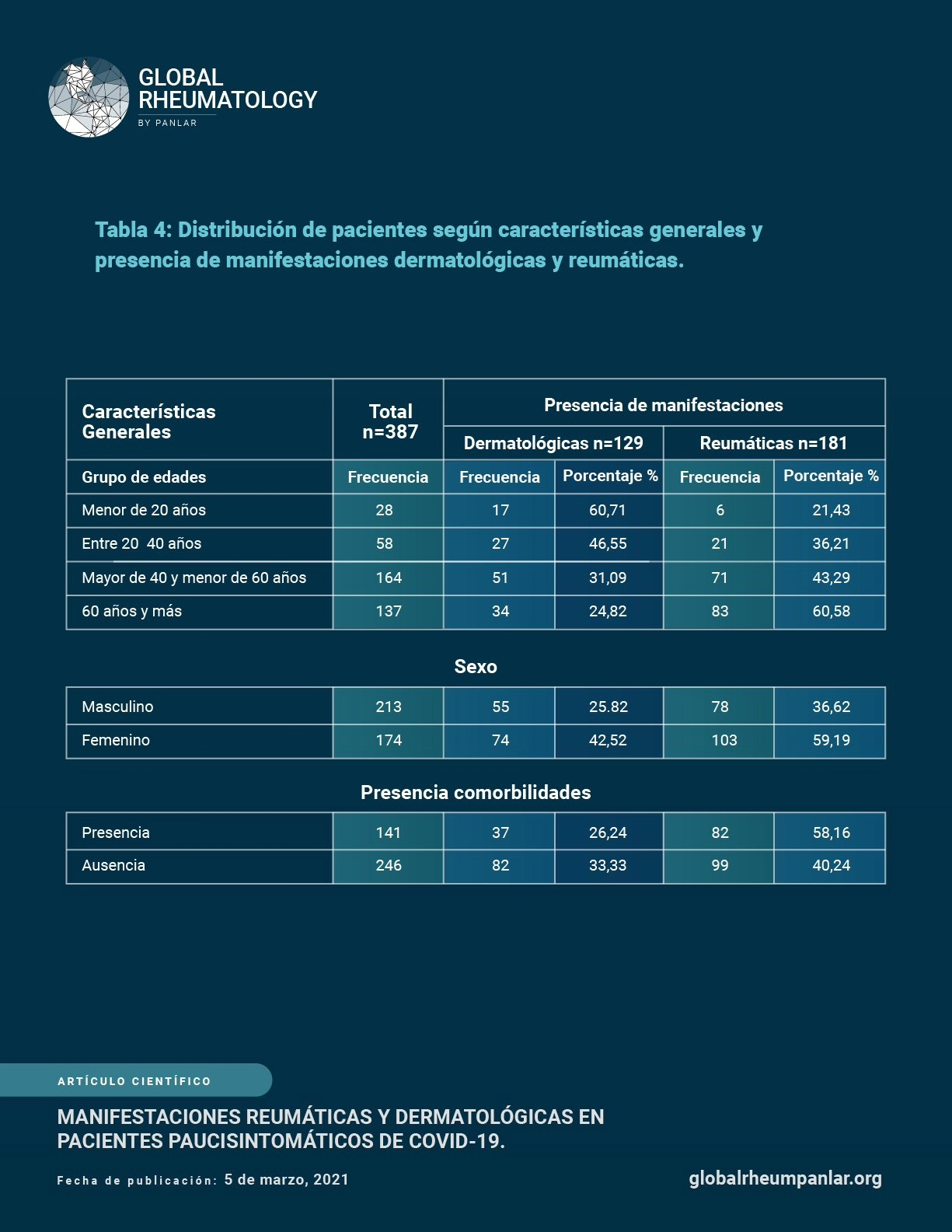 Se concluye que las manifestaciones dermatológicas (Foto1) y reumáticas (Foto 2) se presentan con relativa frecuencia en pacientes con diagnóstico confirmado de COVID-19 como parte del cuadro clínico de la enfermedad. Las manifestaciones dermatológicas se presentan con mayor frecuencia en pacientes menores de 40 años, de sexo femenino y sin presencia de comorbilidades. Las manifestaciones reumáticas son más frecuentes de encontrar en pacientes mayores de 40 años de edad, femeninas y con presencia de comorbilidades asociadas.